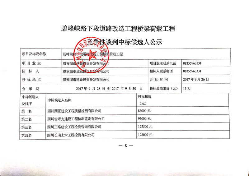 碧峰峽路下段道路改造工程橋梁荷載工程競爭性談判中標候選人公示