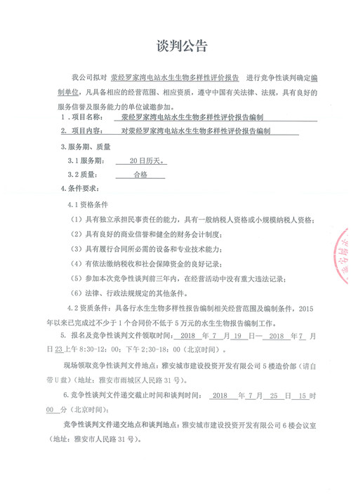 滎經(jīng)羅家灣電站水生生物多樣性評(píng)價(jià)報(bào)告編制——競(jìng)爭(zhēng)性談判