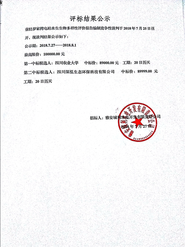 滎經(jīng)羅家灣電站水生生物多樣性評價報告編制競爭性談判評標結(jié)果公示