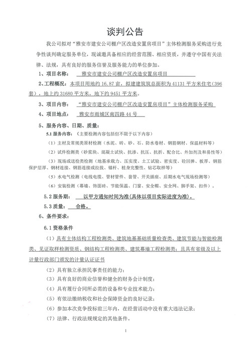 雅安市建安公司棚改區(qū)改造安置房項目主體檢測服務競爭性談判公告