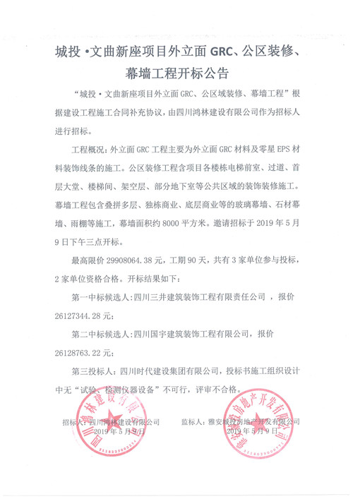 城投·文曲新座項目外立面GRC、公區(qū)裝修、幕墻工程開標公告