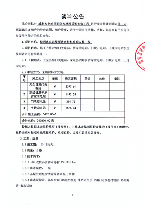 城利水電站屋面防水材料采購(gòu)安裝工程競(jìng)爭(zhēng)性談判公告