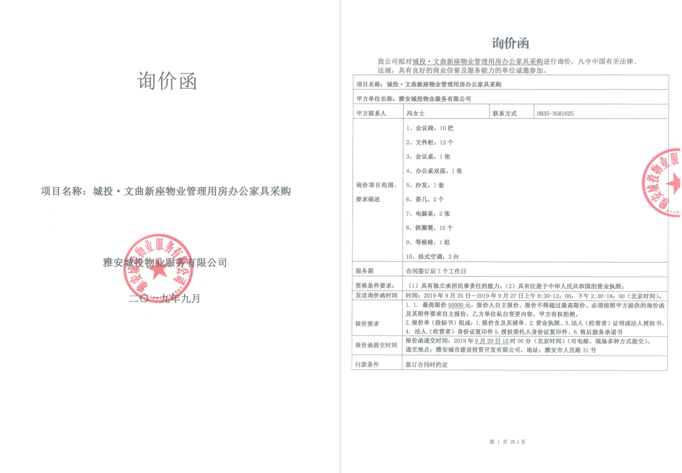城投·文曲新座物業(yè)管理用房辦公家具采購(gòu)詢價(jià)函