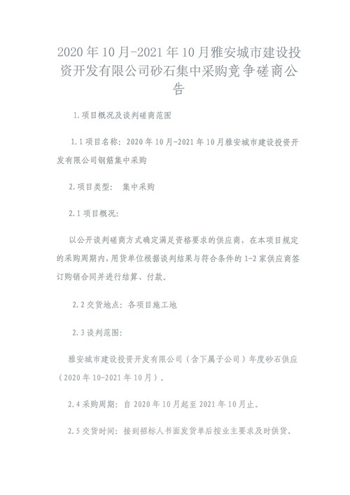 2020年10月-2021年10月雅安城市建設(shè)投資開(kāi)發(fā)有限公司砂石集中采購(gòu)競(jìng)爭(zhēng)磋商公告