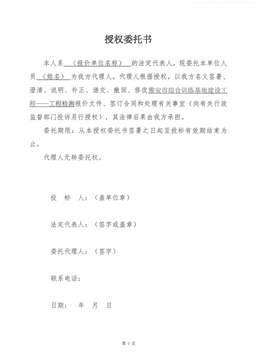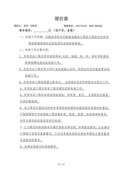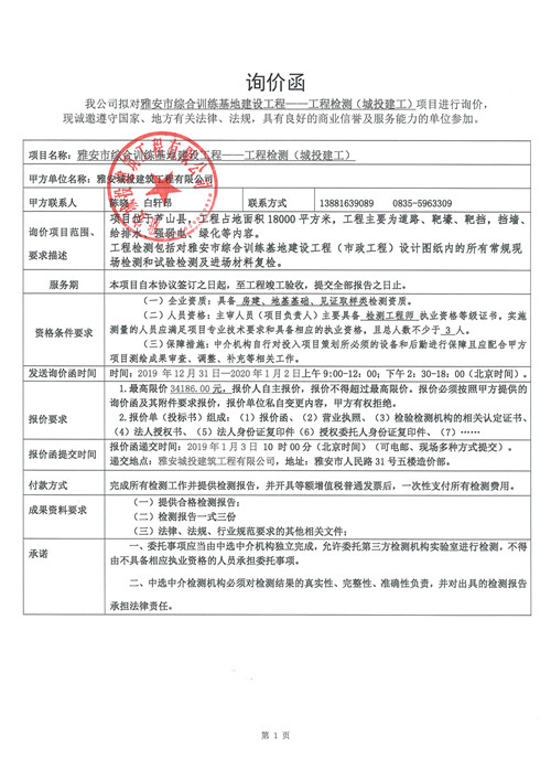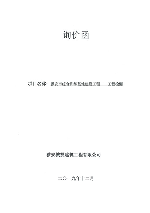 雅安市綜合訓練基地建設工程——工程檢測詢價函