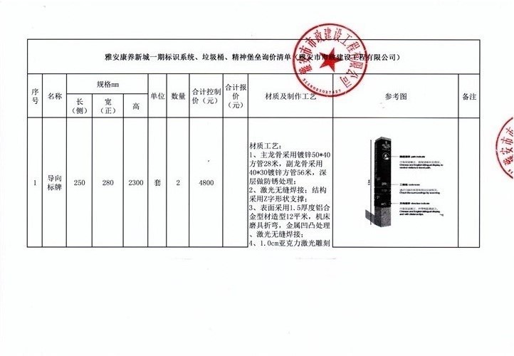 雅安康養(yǎng)新城一期標識系統(tǒng)、垃圾桶、精神堡壘詢價清單(雅安市市政建設工程有限公司)
