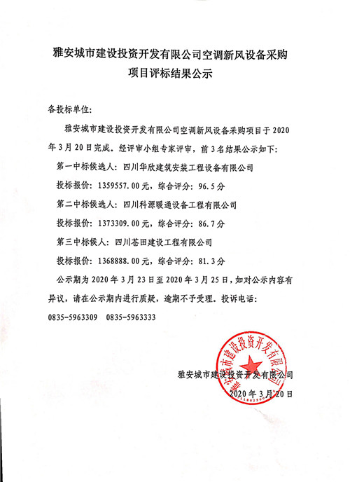 城投公司空調(diào)新風(fēng)設(shè)備采購項目評標(biāo)結(jié)果公示