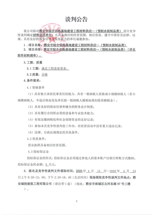 城投建工雅安市綜合訓(xùn)練基地建設(shè)工程材料供應(yīng)—(預(yù)制水泥制品類(lèi))競(jìng)爭(zhēng)性談判公告
