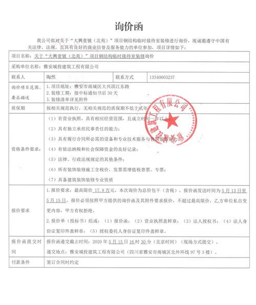 城投建工公司“大興壹號(北苑)”項目鋼結(jié)構(gòu)臨時接待室裝飾裝修詢價函