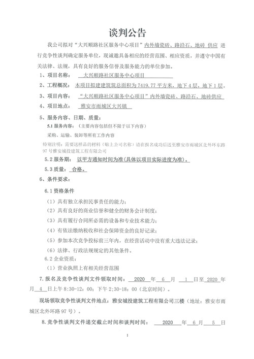城投建工公司“大興順路社區(qū)服務中心項目”內(nèi)外墻瓷磚、路沿石、地磚供應競爭性談判公告