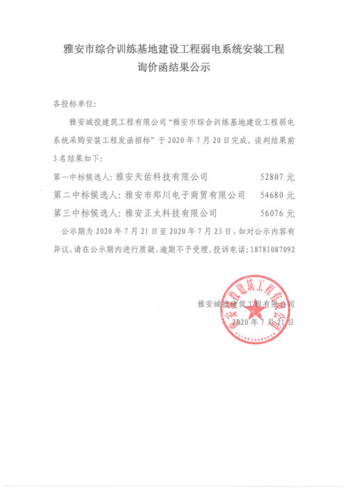 雅安市綜合訓練基地建設工程弱電系統(tǒng)安裝工程詢價函結果公示