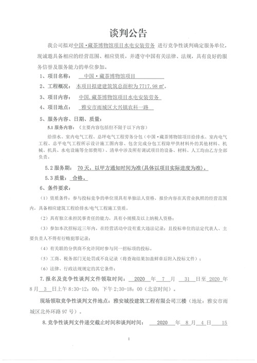 城投建工公司中國·藏茶博物館項目水電安裝勞務(wù)競爭性談判公告