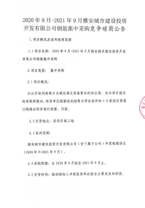 2020年9月-2021年9月雅安城市建設(shè)投資開(kāi)發(fā)有限公司鋼筋集中采購(gòu)競(jìng)爭(zhēng)磋商公告