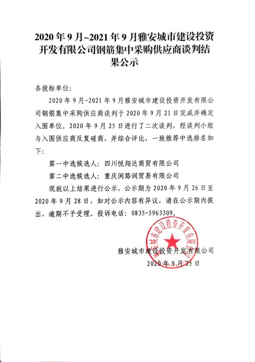 2020年9月—2021年9月雅安城市建設投資開發(fā)有限公司鋼筋集中采購供應商談判結(jié)果公示