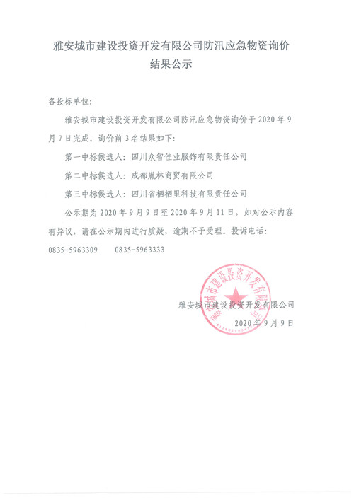 雅安城市建設(shè)投資開發(fā)有限公司防汛應急物資詢價結(jié)果公示