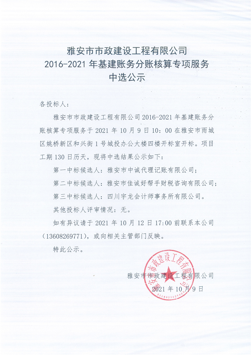 雅安市市政建設(shè)工程有限公司2016-2021年基建賬務(wù)分賬核算專項(xiàng)服務(wù)中選公示