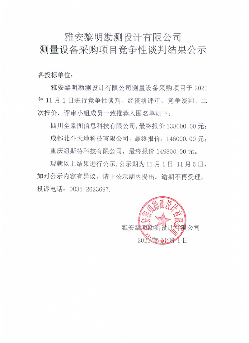 雅安黎明勘測(cè)設(shè)計(jì)有限公司測(cè)量設(shè)備采購(gòu)競(jìng)爭(zhēng)性談判結(jié)果公示