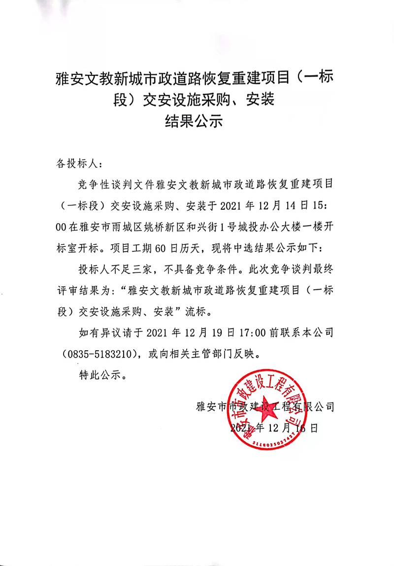 雅安文教新城市政道路恢復(fù)重建項目(一標段)交安設(shè)施采購、安裝結(jié)果公示