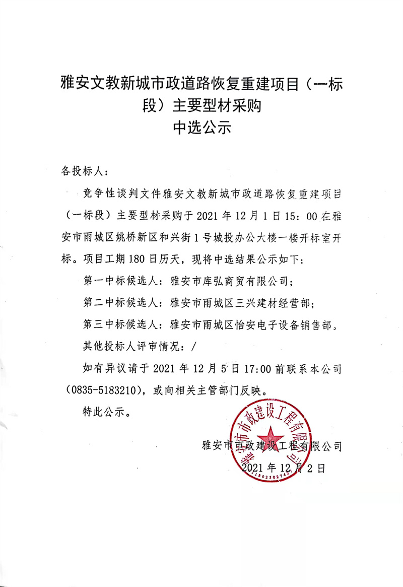 雅安文教新城市政道路恢復重建項目(一標段)主要型材采購中選公示