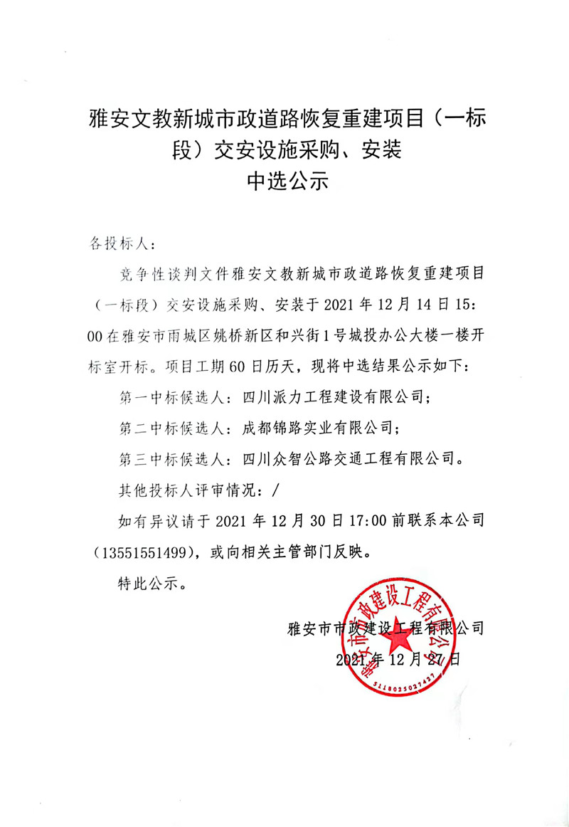 雅安文教新城市政道路恢復(fù)重建項目(一標段)交安設(shè)施采購、安裝中選公示