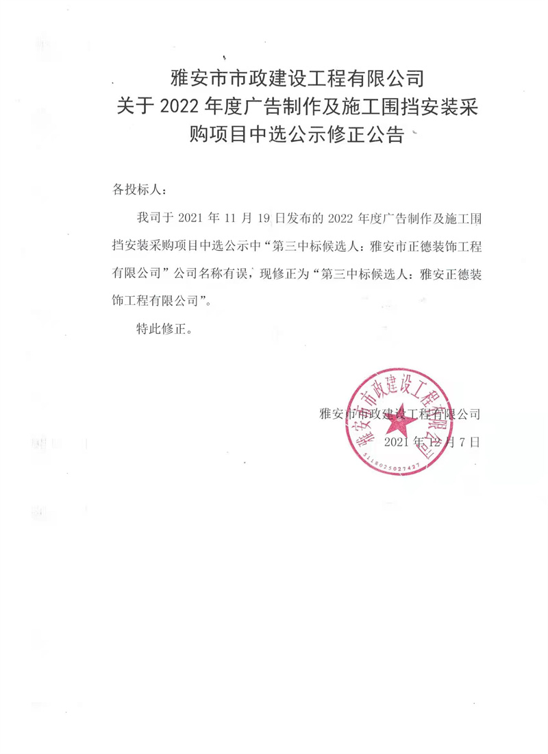 雅安市市政建設(shè)工程有限公司2022年度廣告制作及施工圍擋安裝采購項(xiàng)目中選公示修正公告