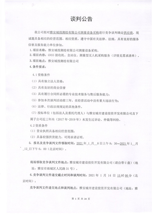 雅安城投測繪有限公司測量設備采購競爭性談判公告