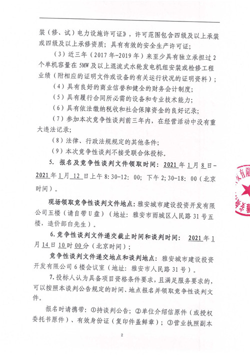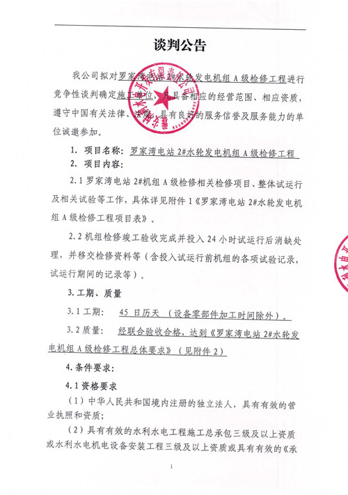城利水電公司羅家灣電站2#水輪發(fā)電機(jī)組A級(jí)檢修工程競(jìng)爭(zhēng)性談判公告
