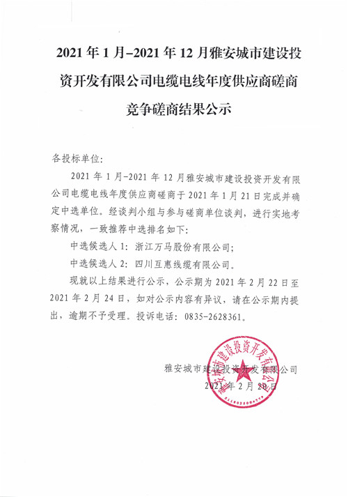 2021年1月-2021年12月雅安城市建設投資開發(fā)有限公司電纜電線年度供應商磋商競爭磋商結果公示