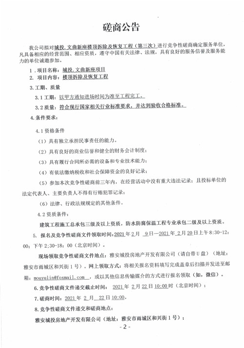 城投.文曲新座樓頂拆除及恢復(fù)工程(第三次)競(jìng)爭(zhēng)性磋商公告
