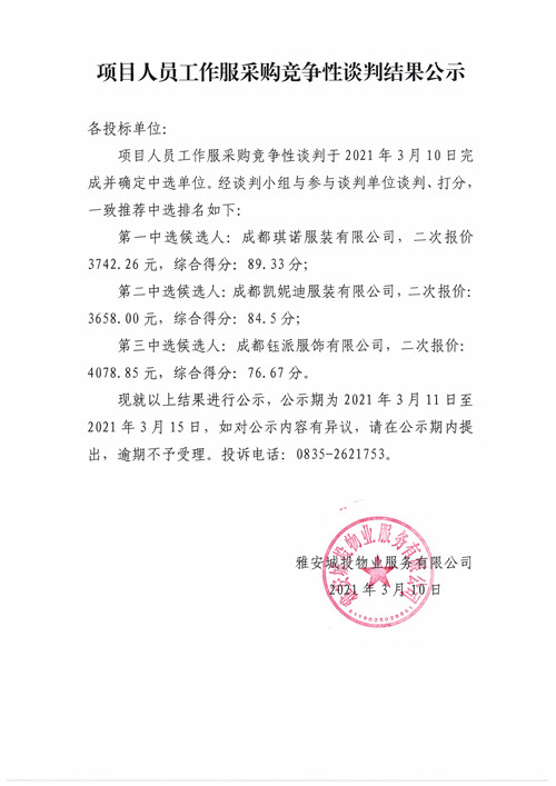 城投物業(yè)公司項目人員工作服采購競爭性談判結(jié)果公示