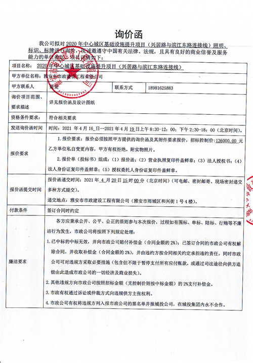 雅安市政公司2020年中心城區(qū)基礎設施提升項目(興居路與濱江東路連接線)照明、標識、標牌詢價函