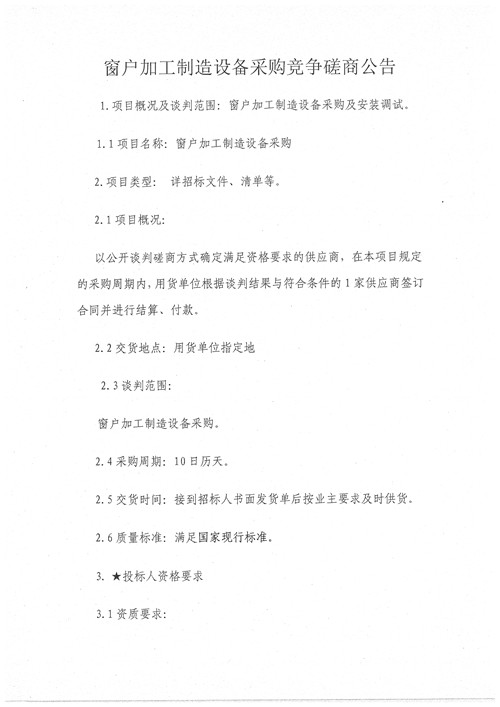 城投工匠公司窗戶加工制造設(shè)備采購競爭磋商公告