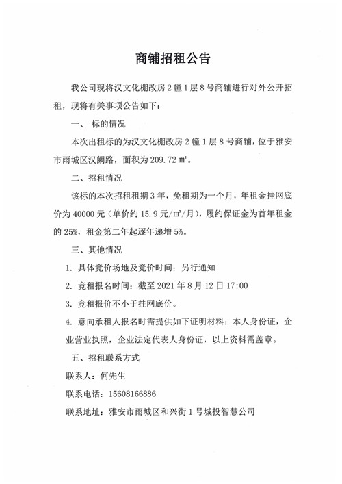 城投智慧公司漢文化棚改房2幢1層8號商鋪招租公告