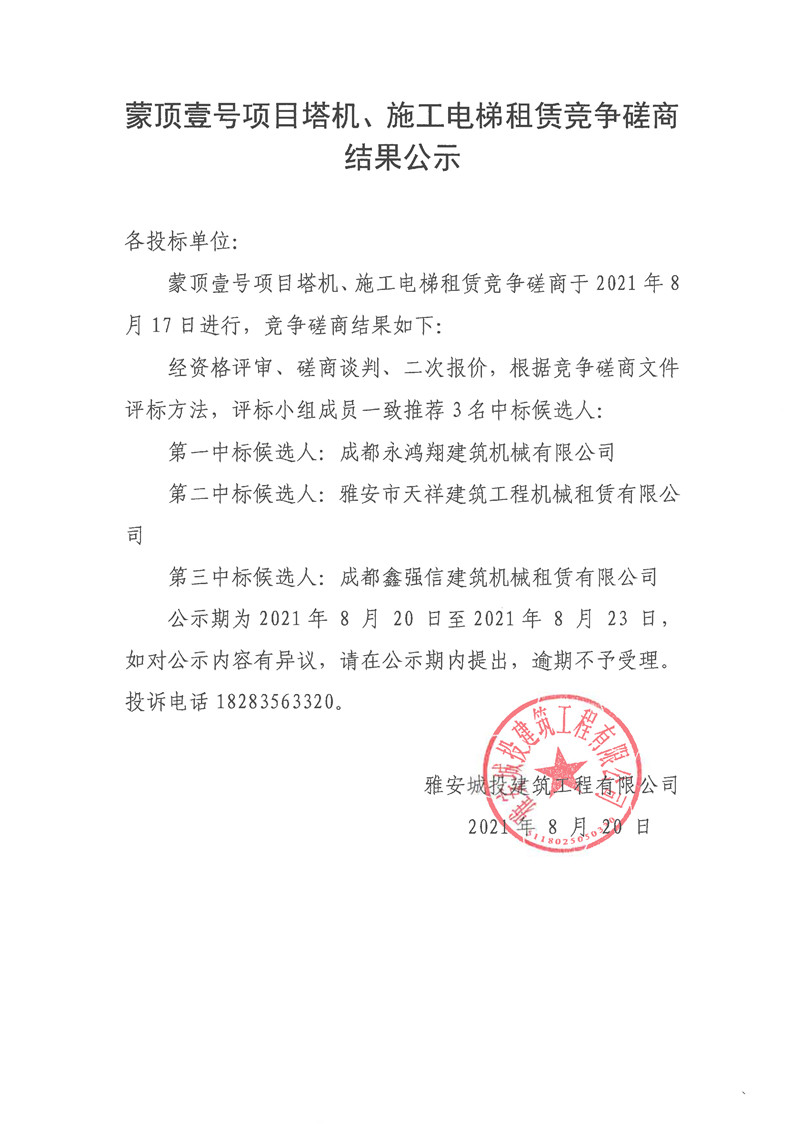 城投建工公司蒙頂壹號項目塔機、施工電梯租賃競爭磋商結(jié)果公告