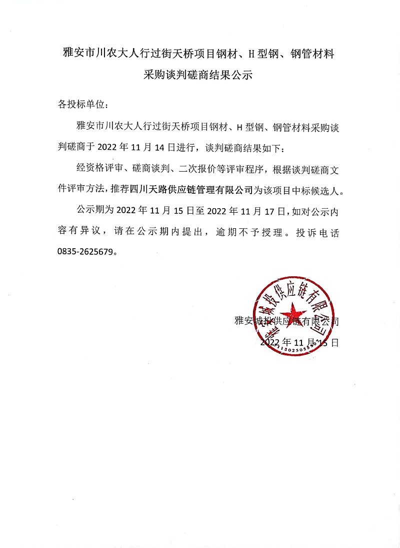 雅安市川大人行過街天橋項(xiàng)目鋼材、H型鋼、鋼管材料采購(gòu)談判磋商結(jié)果公示