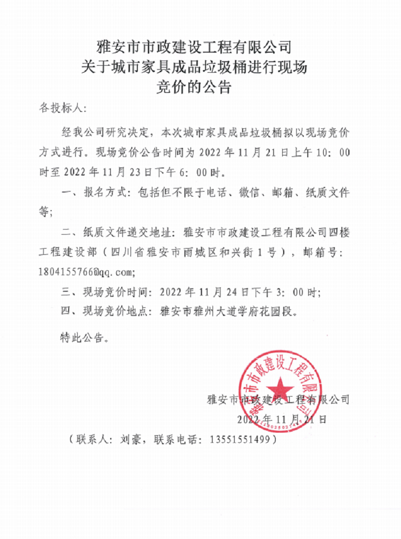 雅安市市政建設(shè)工程有限公司關(guān)于城市家具成品垃圾桶進(jìn)行現(xiàn)場競價(jià)的公告