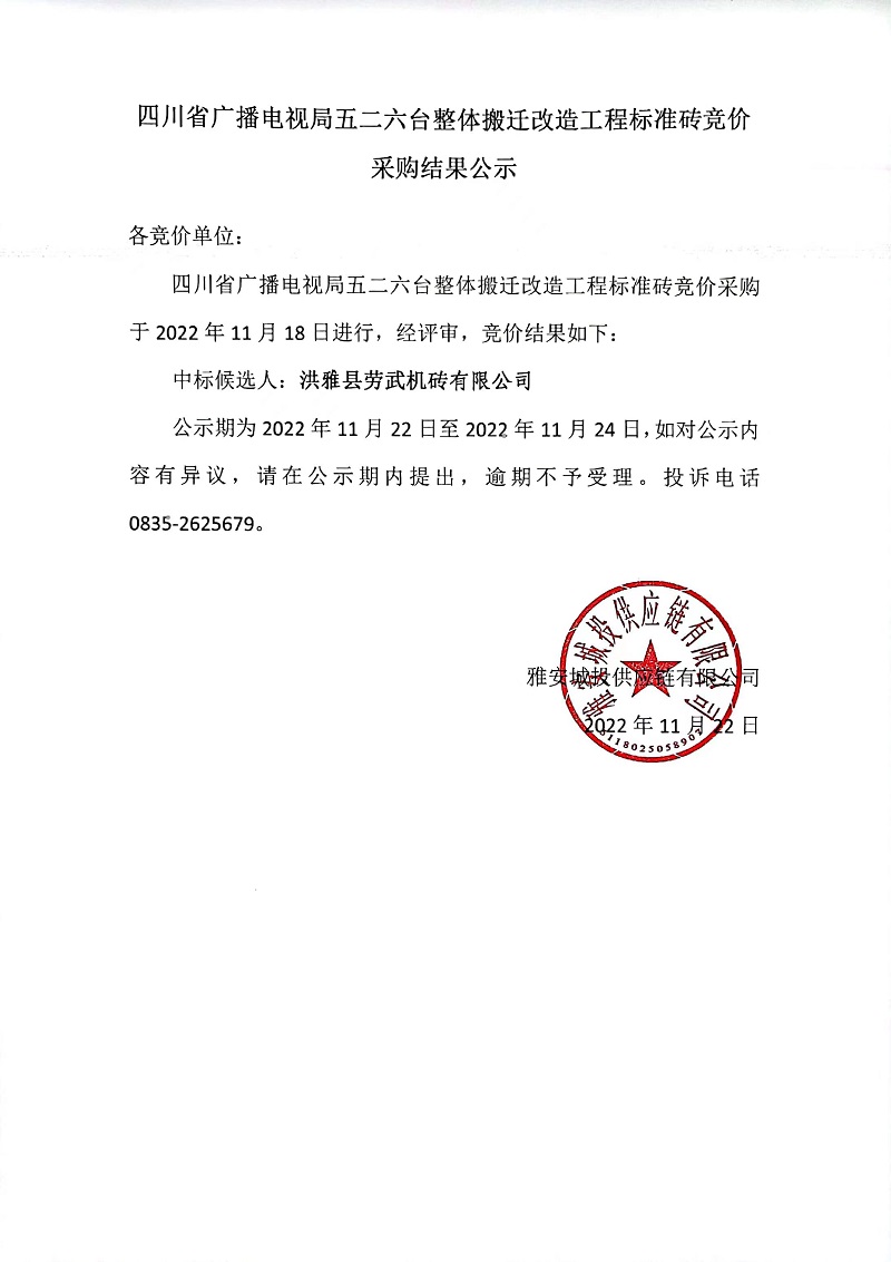 四川省廣播電視局五二六臺整體搬遷改造工程標準磚競價采購結(jié)果公示