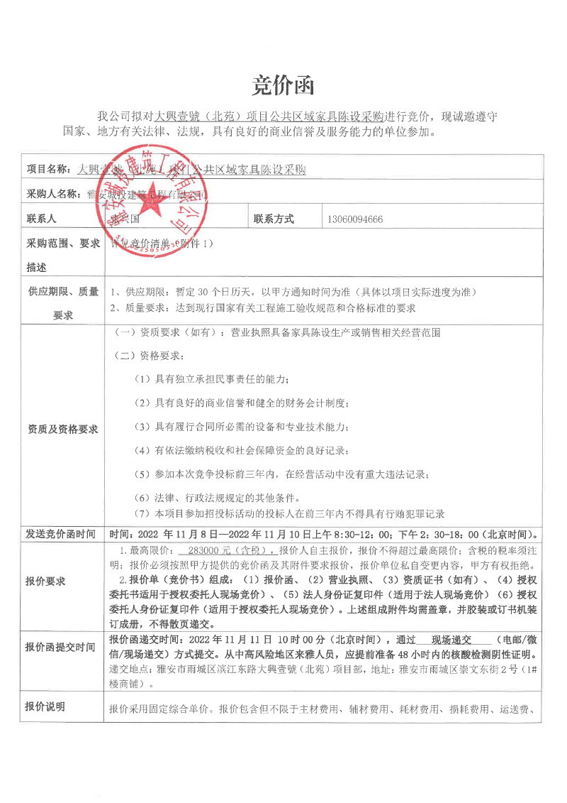 大興壹號(北苑)項(xiàng)目公共區(qū)域家具陳設(shè)采購競價(jià)函