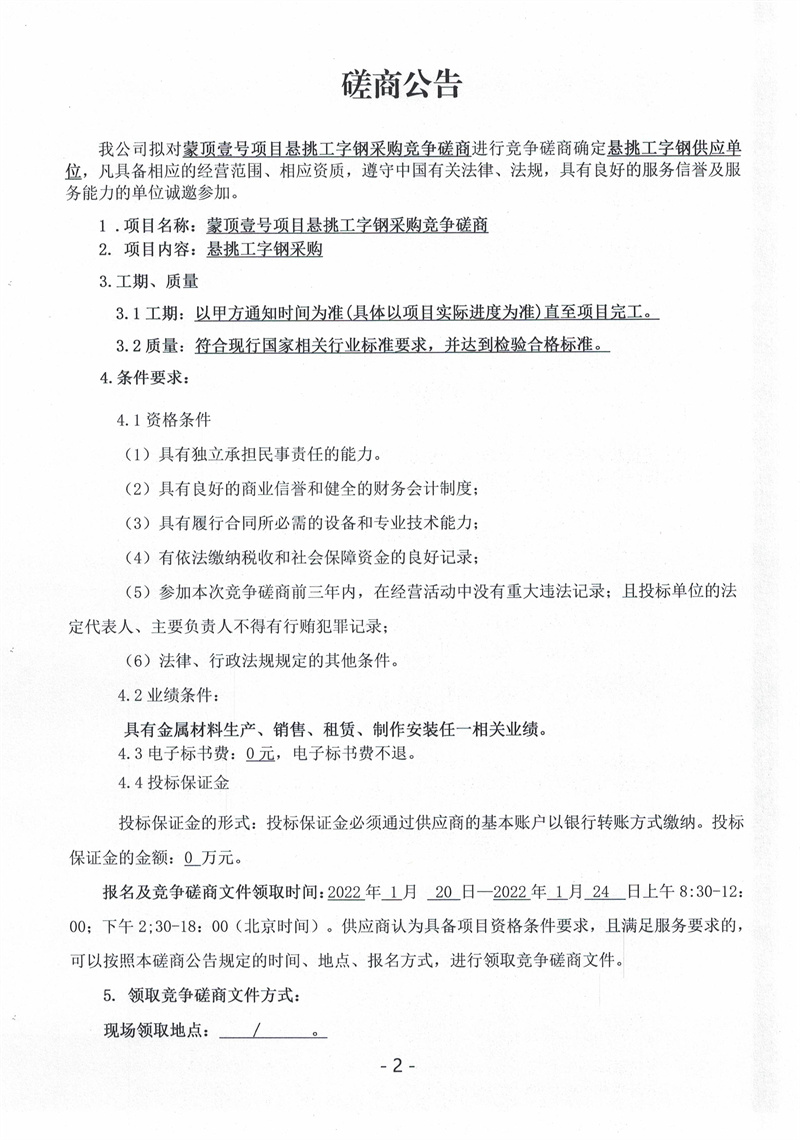 蒙頂壹號(hào)項(xiàng)目懸挑工字鋼采購(gòu)競(jìng)爭(zhēng)磋商公告