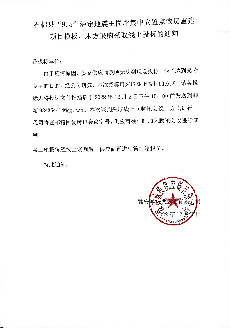 石棉縣“9.5”瀘定地震王崗坪集中安置點農(nóng)房重建項目模板、木方采購線上投標(biāo)的通知