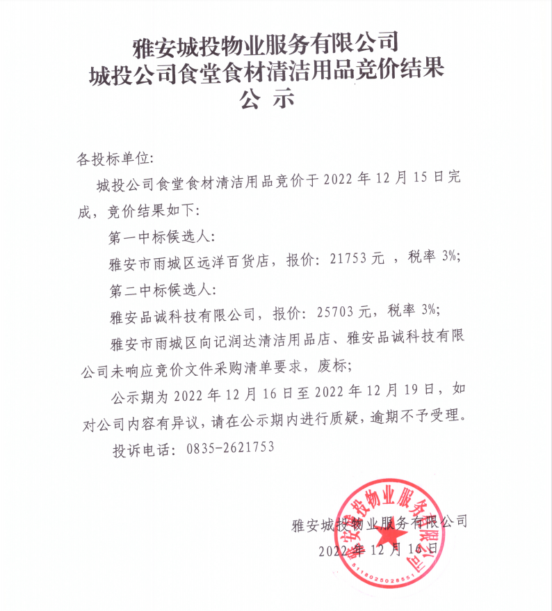 雅安城投物業(yè)服務有限公司城投公司食堂食材清潔用品競價結果公示