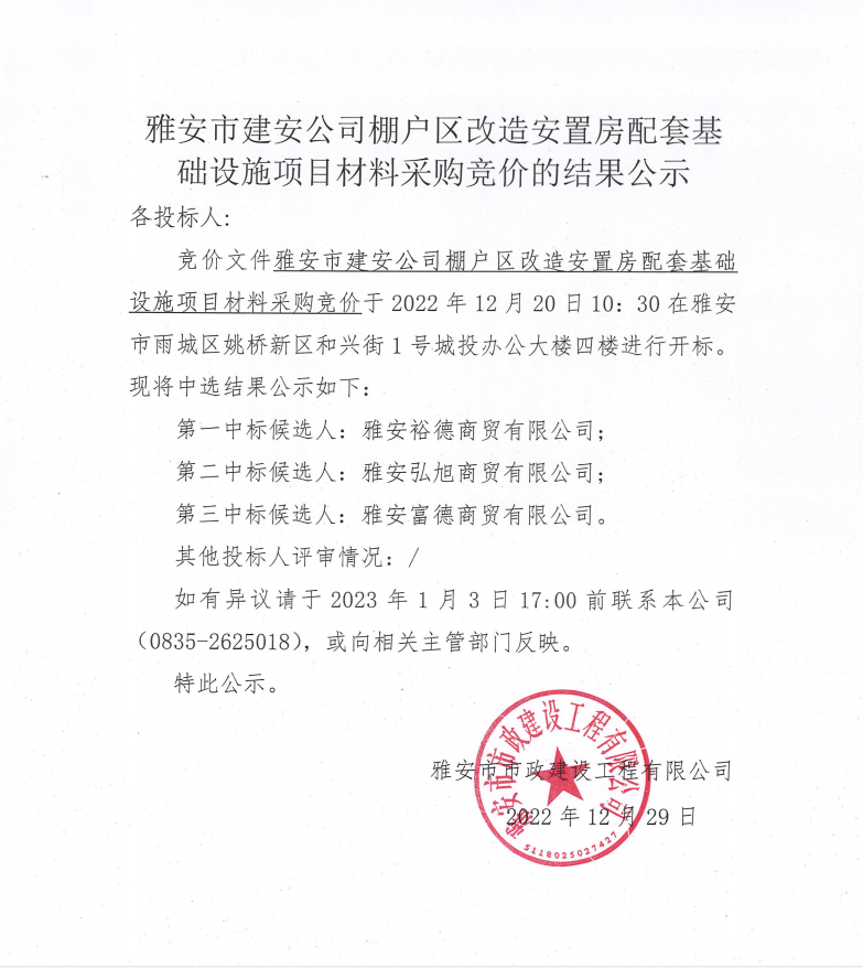 雅安市建安公司棚戶區(qū)改造安置房配套基礎(chǔ)設(shè)施項(xiàng)目材料采購競價結(jié)果公示