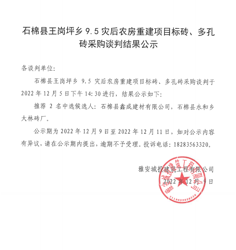 石棉縣王崗坪鄉(xiāng)9.5災(zāi)后農(nóng)房重建項目標磚、多孔磚采購談判結(jié)果公示