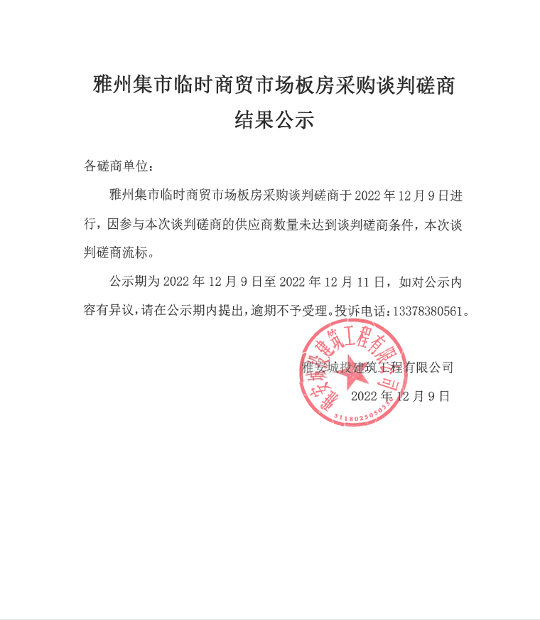 雅州集市臨時商貿(mào)市場板房采購談判磋商結(jié)果公示