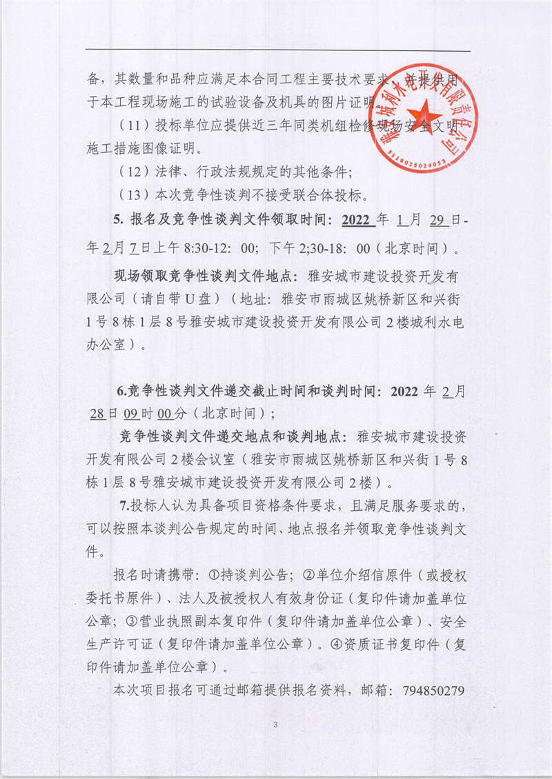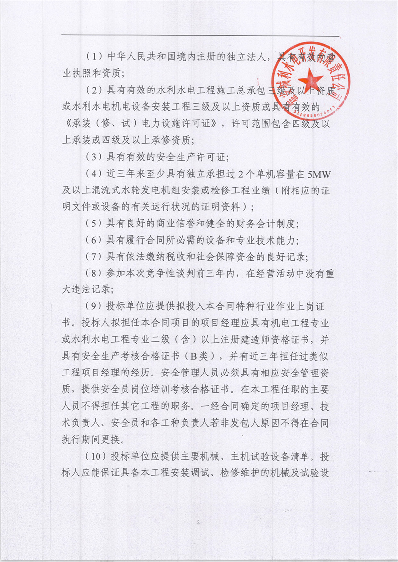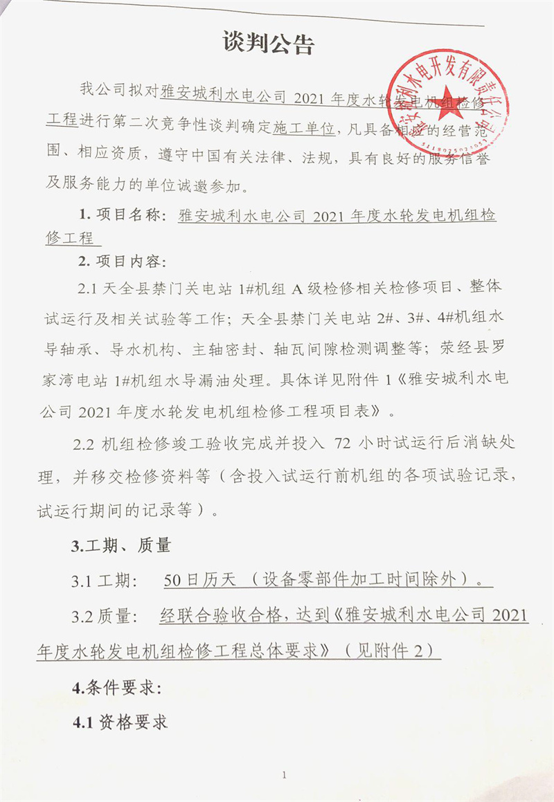 雅安城利水電公司2021年度水輪發(fā)電機(jī)組檢修工程競爭性談判公告(第二次)