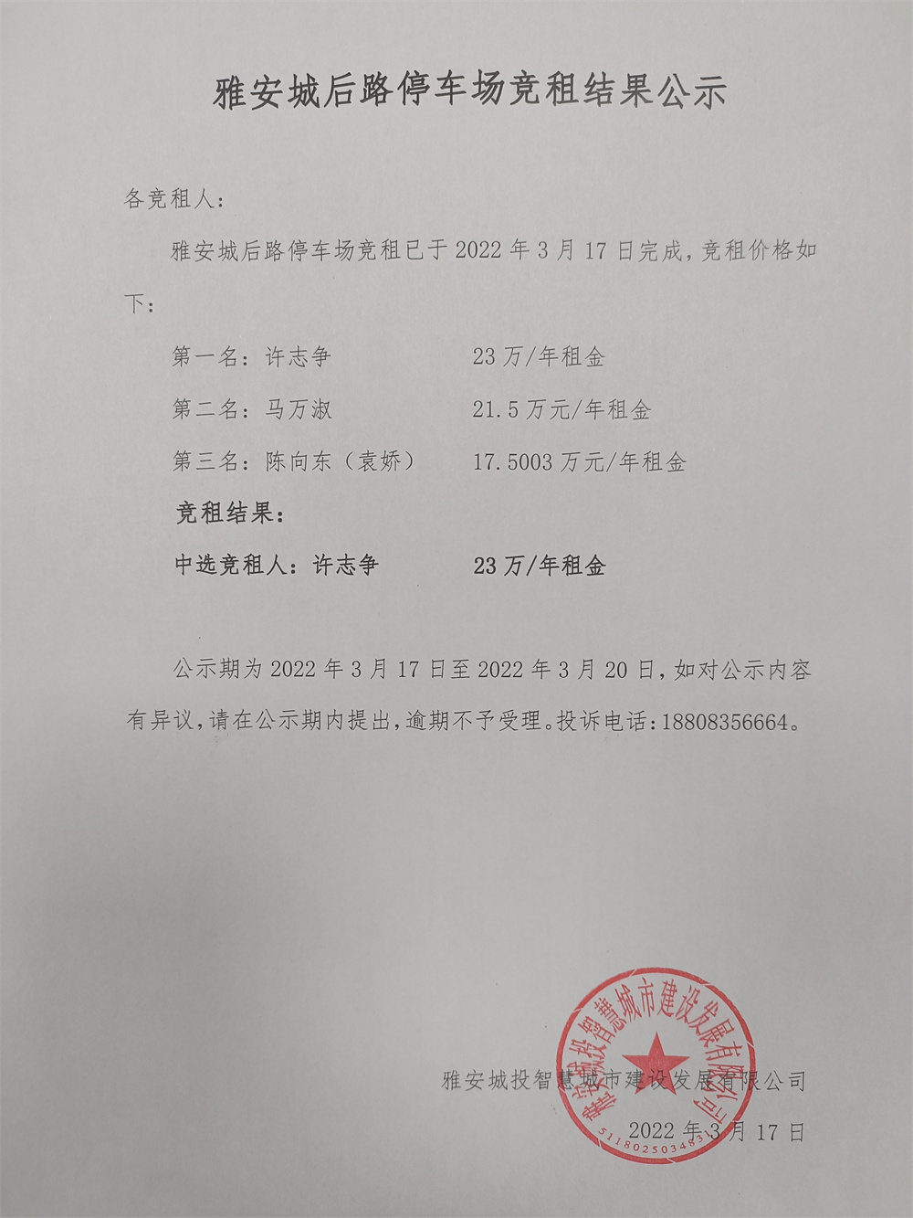 雅安城后路停車場競租結(jié)果公示