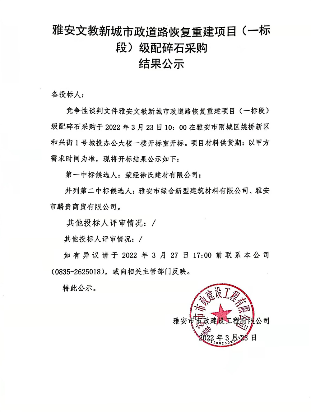 雅安文教新城市政道路恢復(fù)重建項(xiàng)目(一標(biāo)段)級配碎石采購結(jié)果公示