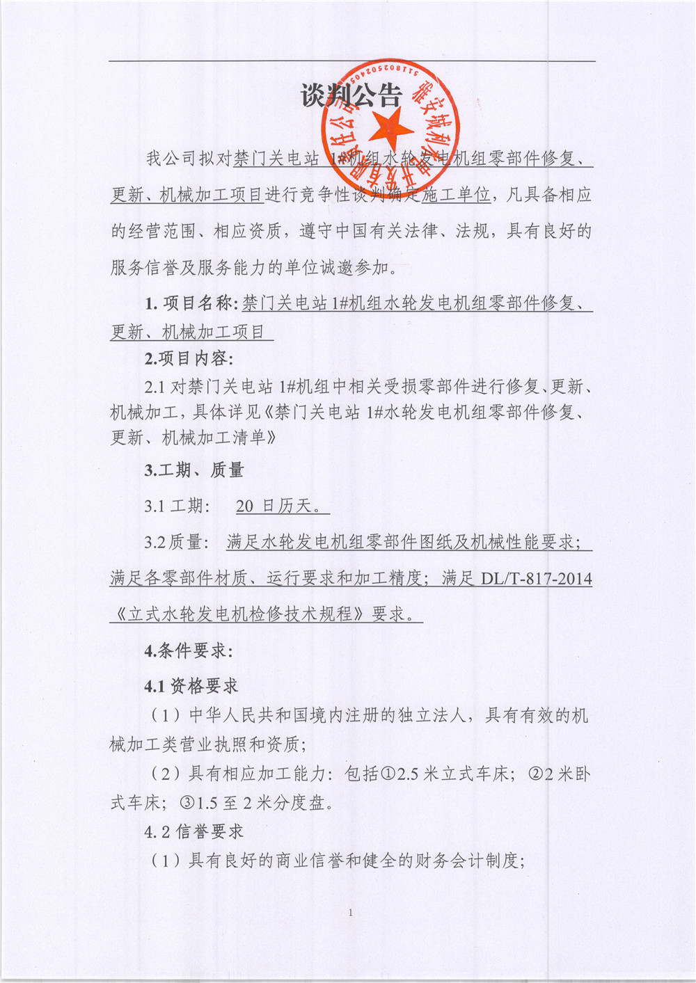 禁門關(guān)電站1#機組水輪發(fā)電機組零部件更新、機械加工項目競爭性談判公告