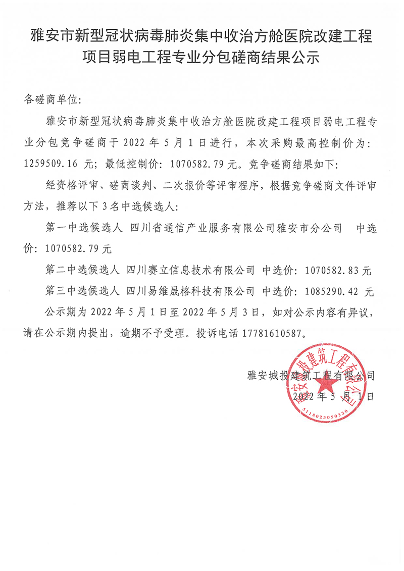 雅安市新型冠狀病毒肺炎集中收治方艙醫(yī)院改建工程項目弱電工程專業(yè)分包磋商結(jié)果公示