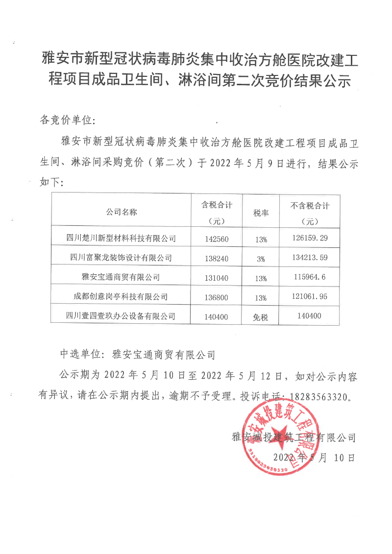 雅安市新型冠狀病毒肺炎集中收治方艙醫(yī)院改建工程項(xiàng)目成品衛(wèi)生間、淋浴間競(jìng)價(jià)(第二次)結(jié)果公示